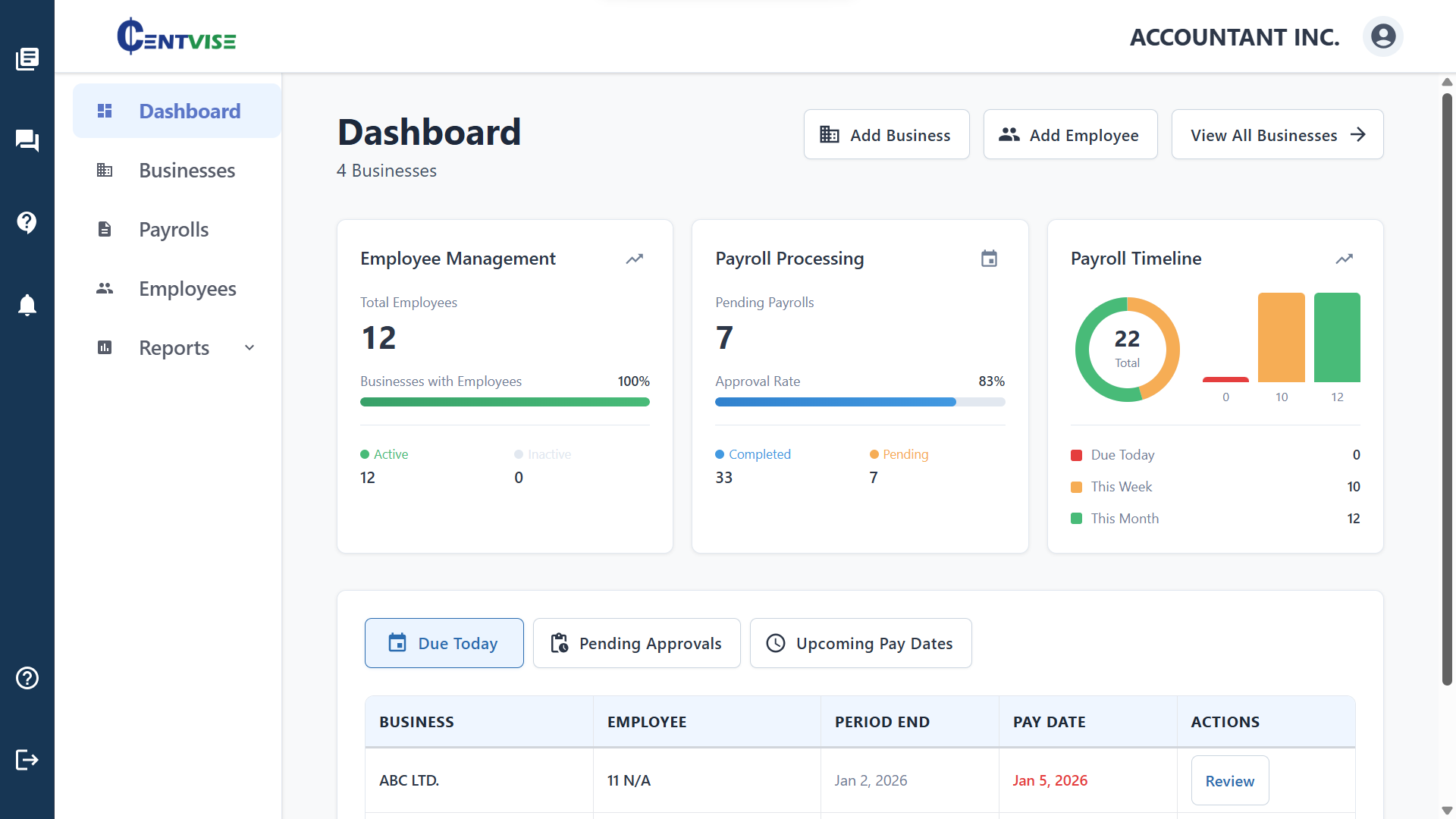 Centvise is not generic payroll software. It's a specialized platform engineered specifically for Canadian accounting firms managing payroll for multiple clients.